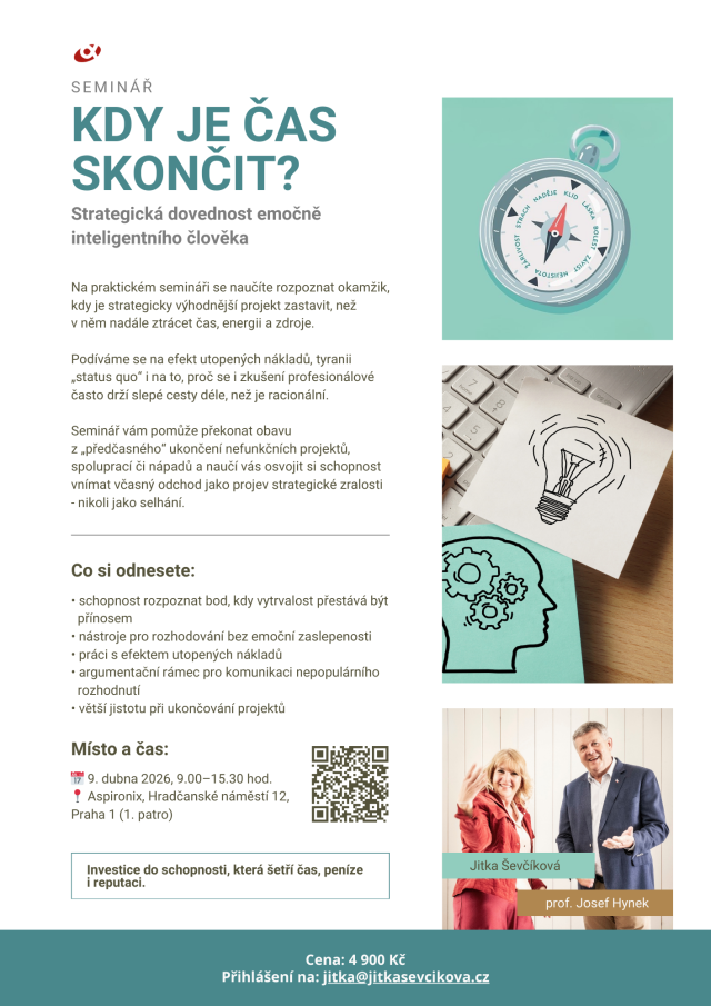 Na praktickém semináři se naučíte rozpoznat okamžik, kdy je strategicky výhodnější projekt zastavit, než v něm nadále ztrácet čas, energii a zdroje.