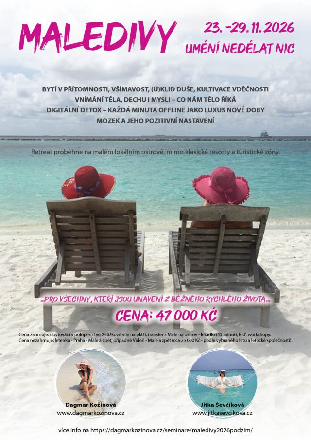 Na Maledivách, obklopeni nekonečným modrým oceánem a bílými plážemi, se zastavíme a budeme opravdu prožívat přítomný okamžik. Společně se naučíme vnímat své tělo, dech i mysl, odložit digitální svět a dopřát si luxus každé minuty offline.