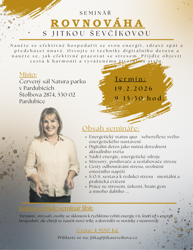 Naučte se efektivně hospodařit se svou energií, zdravě spát a předcházet únavě. Osvojte si techniky digitálního detoxu a naučte se, jak efektivně pracovat se stresem. Přijďte objevit cestu k harmonii a vyvážené,u životnímu stylu.