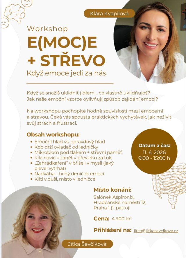 Na workshopu pochopíte hodné souvislostí mezi emocemi a stravou. Ceká vás spousta praktických vychytávek, jak neživit svůj strach a frustraci.